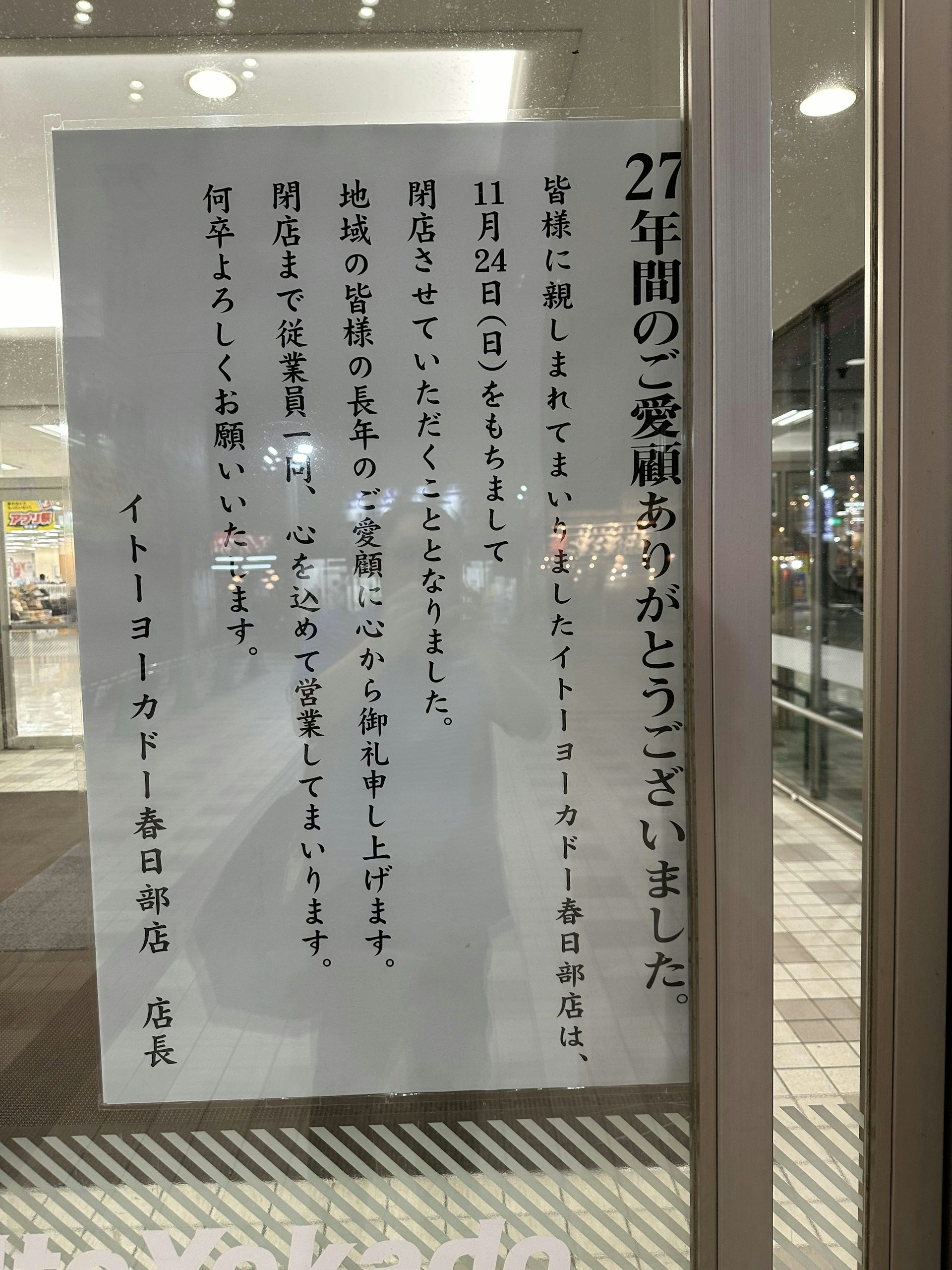 伊藤洋华堂春日部店的大门贴有结业告示。