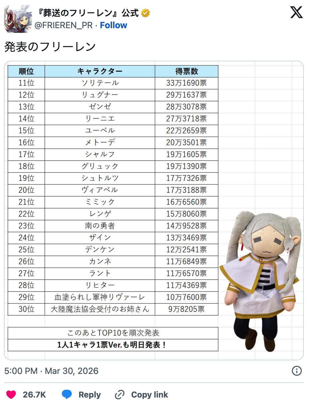 接下来,位列第四名到第六名的角色,依次是本作的核心主角芙莉莲、