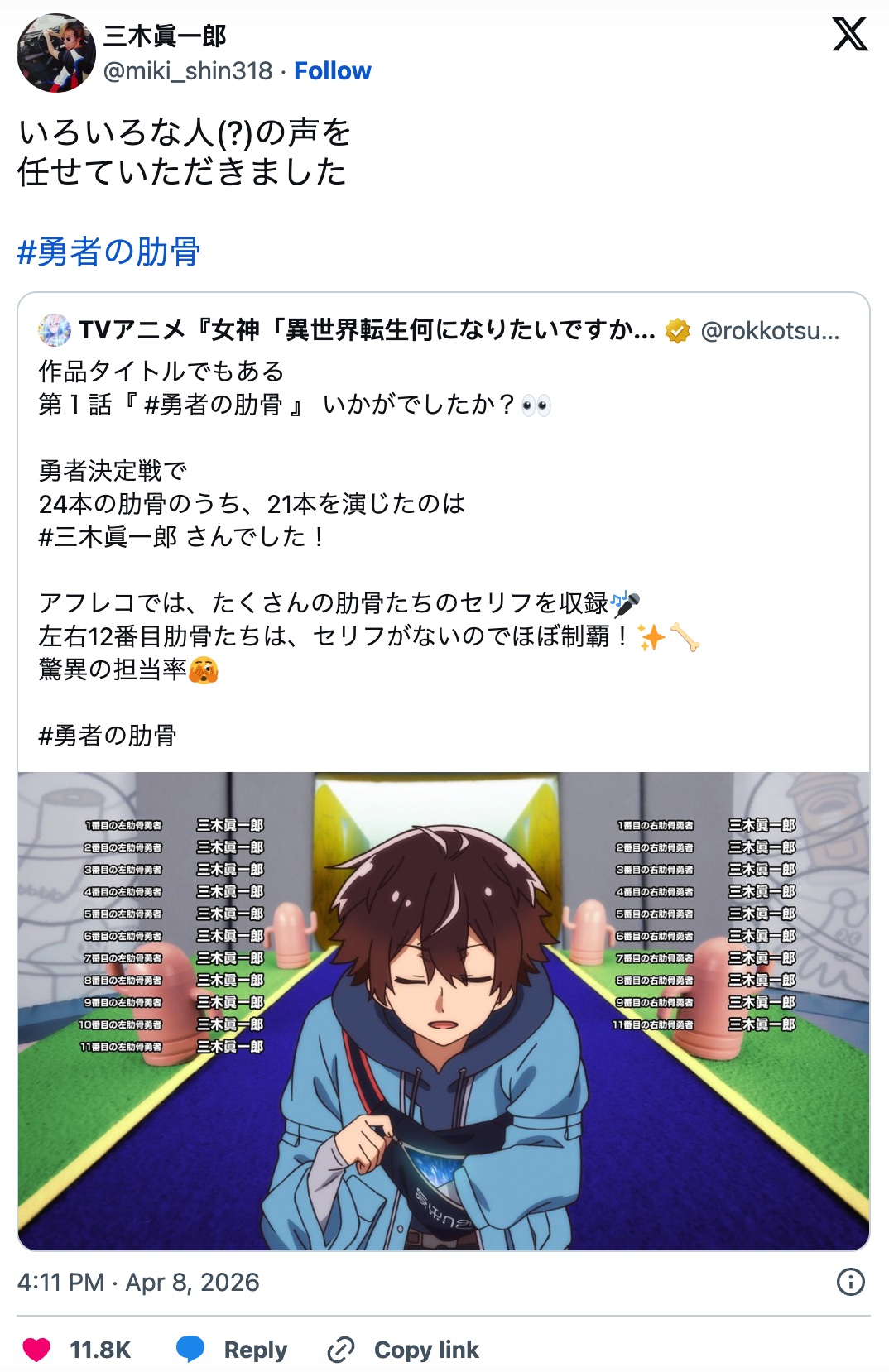 这部作品刚一上线就引发了热烈讨论,原因竟然是知名声优三木真一郎在剧中一人分饰 22 个角色,而更离谱的是,这其中有 21 个角色居然全都是肋骨!