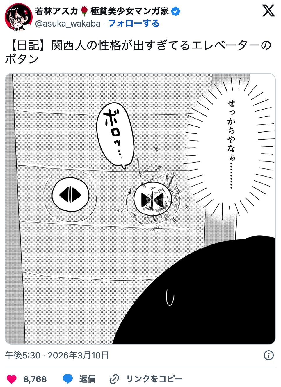 看着这个惨不忍睹的按键,脑海中立刻就能自动播放出急性子的大阪人为了赶时间,急不可耐地疯狂连击电梯开关的生动画面。这条充满浓郁地方色彩的推文,迅速斩获了超过472万次的惊人阅读量。