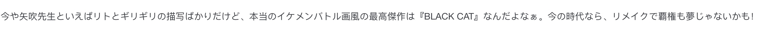 他前不久在网络上发布了一则动态,大方地分享了自己的独特见解,直言不讳地表示矢吹健太朗曾经在 JUMP 杂志上连载的《黑猫》( BLACK CAT )如果是放在现代才开启连载之路,凭借现在的审美和传播速度,热度必将不可同日而语。