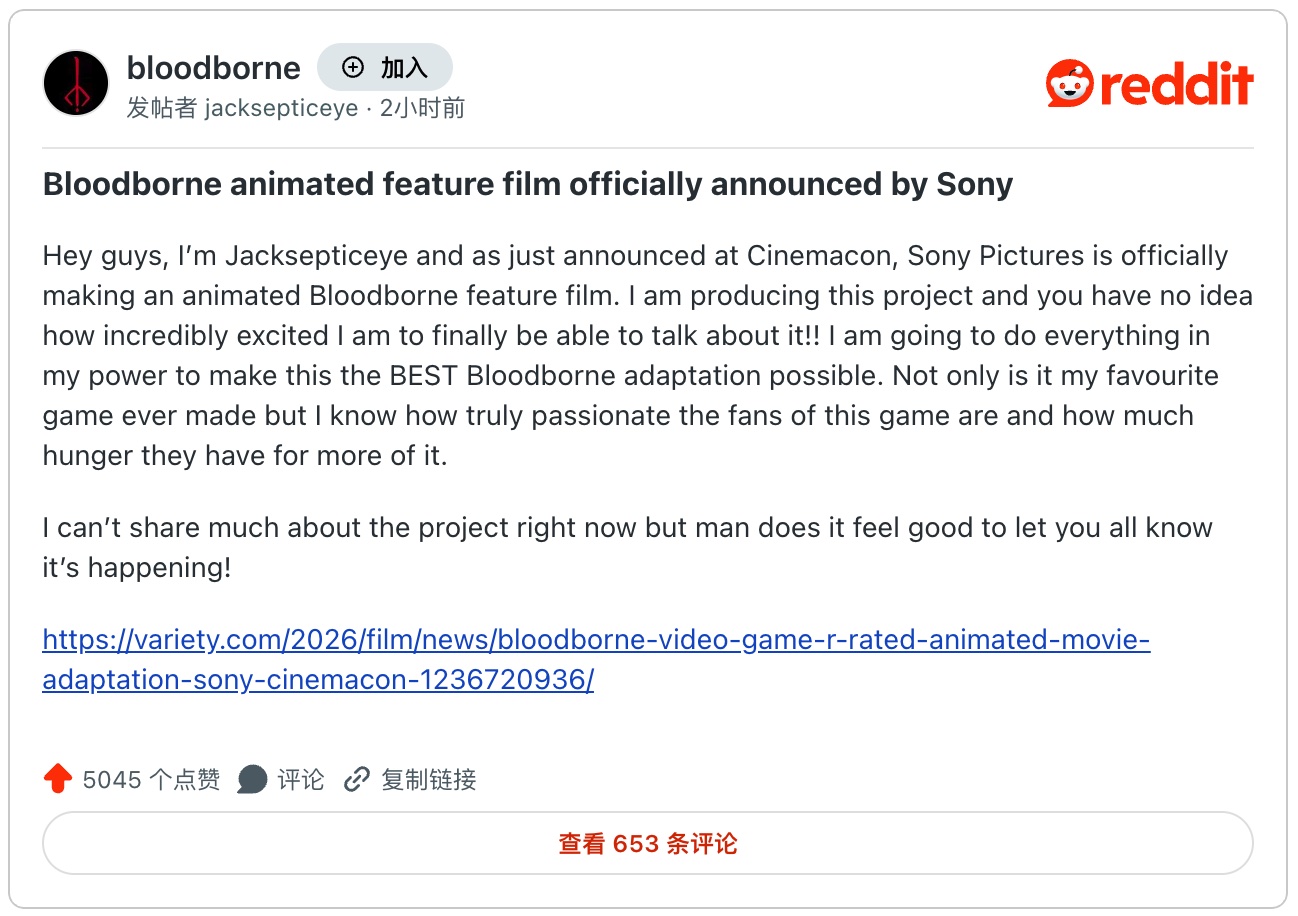 激动万分的他在帖子里如此写道:“嘿,大家好,我是 JackSepticEye 。正如刚才在 CinemaCon 现场所宣布的那样,索尼影业此刻正在正儿八经地捣鼓一部《血源诅咒》的动画长篇巨制。