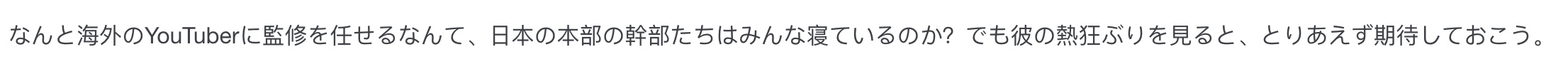 “居然让一位海外的YouTuber来当监制,日本本部的高管们都在集体睡觉吗?不过看他那么狂热,老夫就姑且期待一下吧。”
