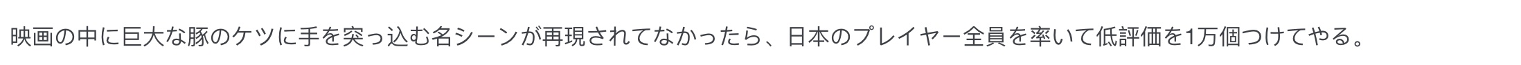 “如果电影里没有还原把手捅进巨大变异猪屁股里的名场面,我会带领所有日本玩家给它打满一万个差评的。”