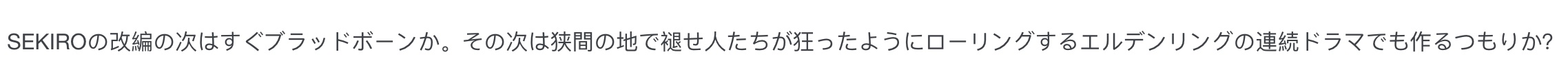“《只狼》改编之后马上就轮到血源,接下来是不是就要拍一群褪色者在交界地疯狂翻滚的艾尔登法环连续剧了?”