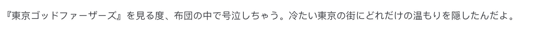 “每次看《东京教父》都在被窝里爆哭,他在冰冷的东京街头藏了多少温暖啊。”