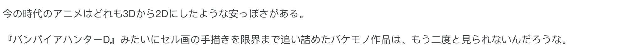 “现在的动画全是3D套皮的廉价感,像《吸血鬼猎人D》这种把赛璐璐手绘逼到绝境的怪物,再也看不见咯!”