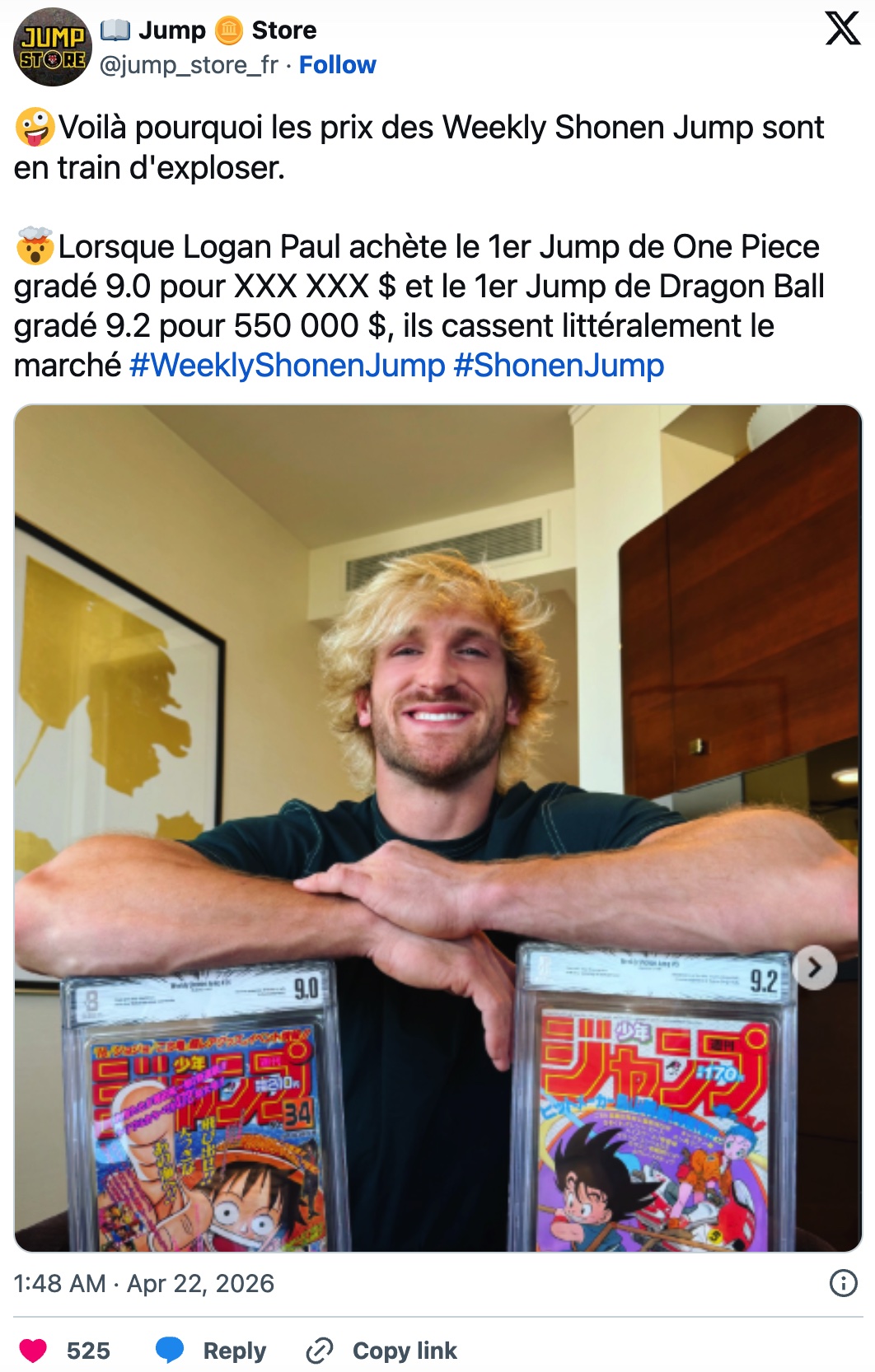 根据海外媒体的跟踪报道,那位来自国外的知名日本漫画狂热粉丝 Logan Paul ,就曾豪掷数十万美元的天价,一口气买下刊登上古神作《航海王》( One Piece )第一章的《周刊少年 Jump 》( Weekly Shonen Jump )。