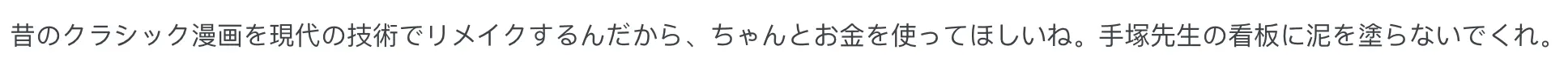 “把经典老漫画用现代技术重制,希望这次能花对钱,不要毁了手塚大神的招牌啊。”