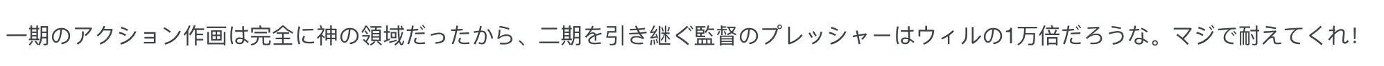 “第一季的动作作画完全是神仙打架,接手第二季的导演压力估计比威尔多一万倍吧,千万撑住啊!”