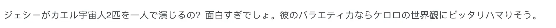 “杰西居然要一人配两个外星青蛙?这也太搞笑了,他的综艺感本来就很强,感觉完美契合Keroro的画风。”