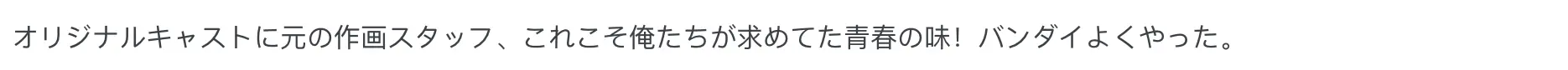 “原班配音加上原来的作画班底,这就是我们想要的青春原汁原味!万代干得漂亮。”