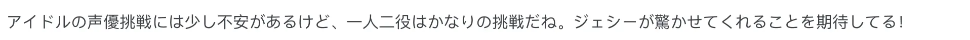 “虽然对跨界配音有点担忧,但一人分饰两角确实是个大挑战,希望杰西能给我带来惊喜吧!”