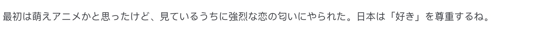 一开始以为只是福利番,结果被硬壳的恋爱酸臭味酸倒,日本对热爱的尊重拿捏得很死。