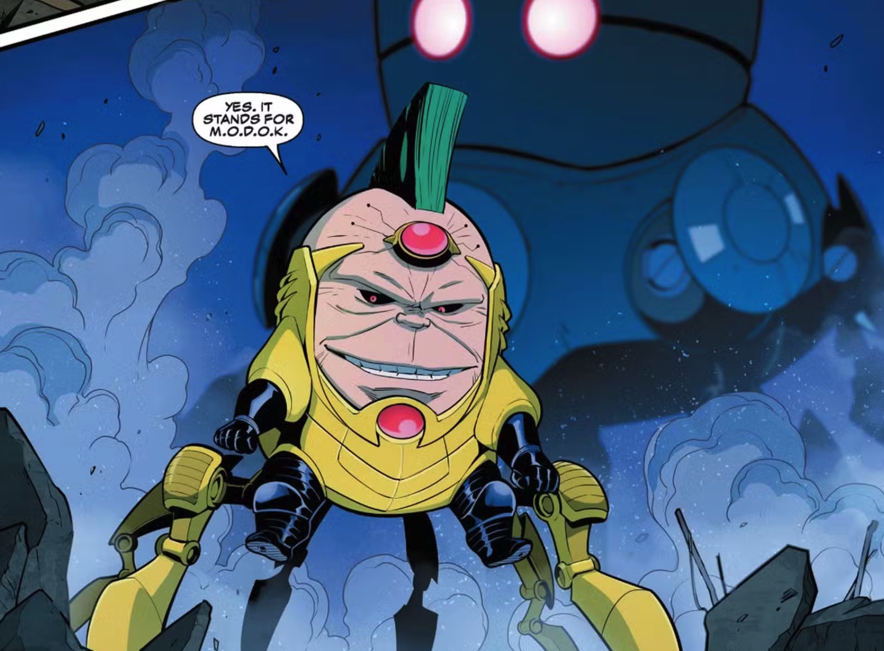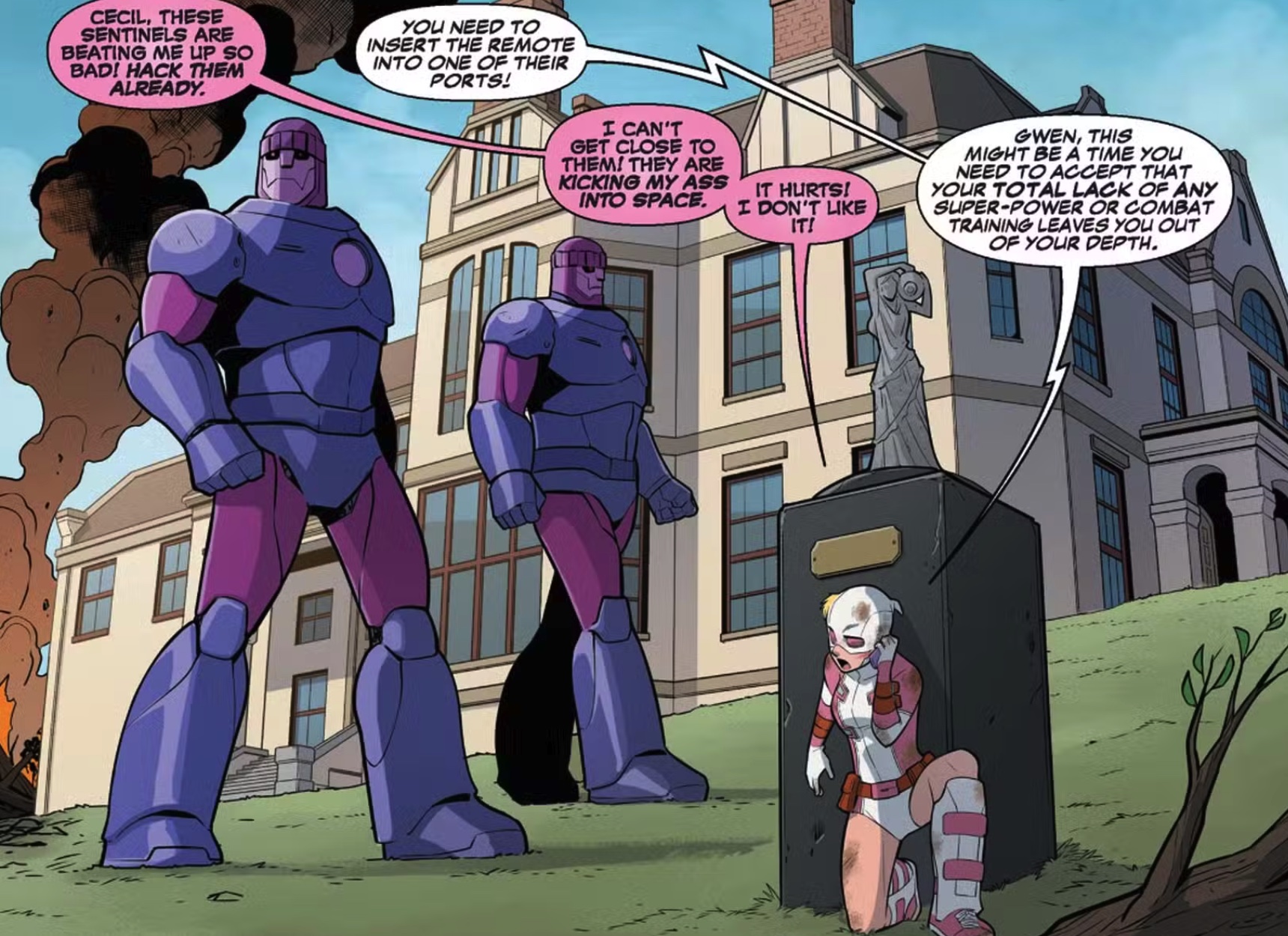 创刊号开头就很炸裂,格温用她在现实打街机学到的连招打爆了哨兵机器人,却因为破坏公物被赖账。穷困的她毫不犹豫把另一个同行踹进火坑抢功劳。然而搞笑外表下藏着残酷的心,那个同行是恶人 MODOK 的人。