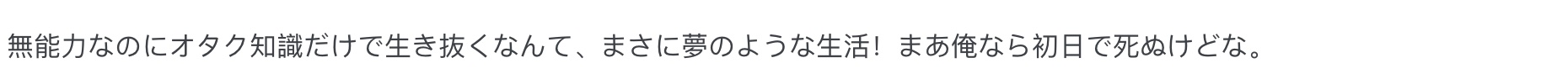 “无能力全靠死宅知识在这世界里生存,这简直就是我梦想中的生活啊!虽然肯定活不过第一天。”