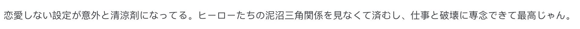 “不会谈恋爱的设定意外地很清流,终于不用看英雄们狗血的三角恋了,专心搞事业搞破坏多好。”