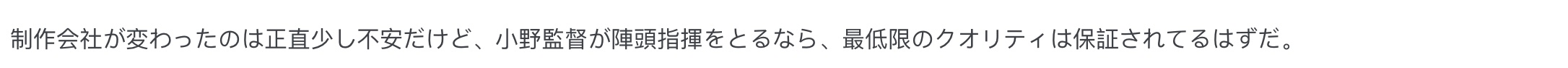 “制作公司竟然换了,说实话心里有点打鼓,不过有小野导演坐镇把关,这部剧的下限应该还是很有保证的。”