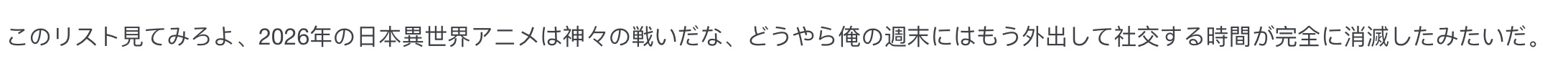 “大家快看这片单,2026年日本异世界新番简直是神仙打架,看来我的周末已经彻底没有时间出门去社交了。”