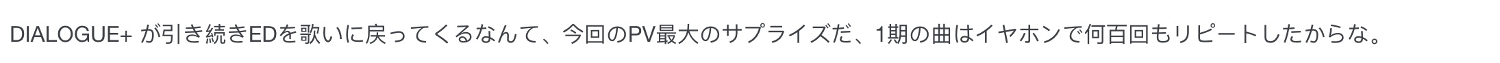 “能让 DIALOGUE+ 继续回来唱ED简直是本期PV给出的最大惊喜,想当年第一季的单曲我可是戴着耳机循环了几百遍。”