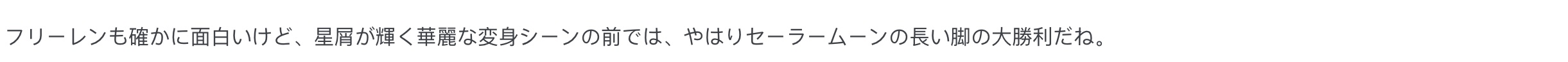 “虽然芙莉莲也很好看,但是在星光璀璨的华丽变身环节面前,还是美少女战士的大长腿赢麻了啊。”